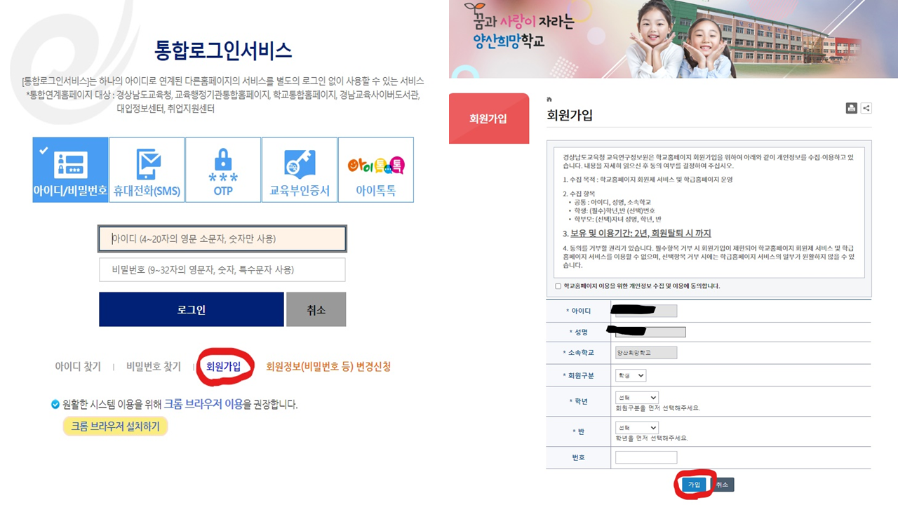 양산희망학교 홈페이지 회원가입 절차 안내