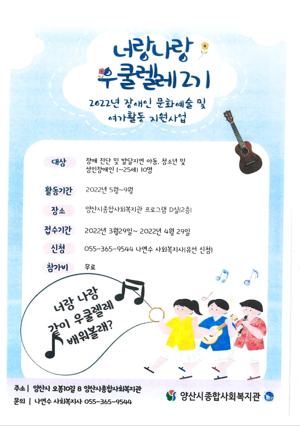 1. 양산시 종합사회복지관에서 장애인 문화 예술 및 여가활동 지원 사업을 운영하고자 하오니 관심있 는 학생들에게 홍보하여 주시기 바랍니다.