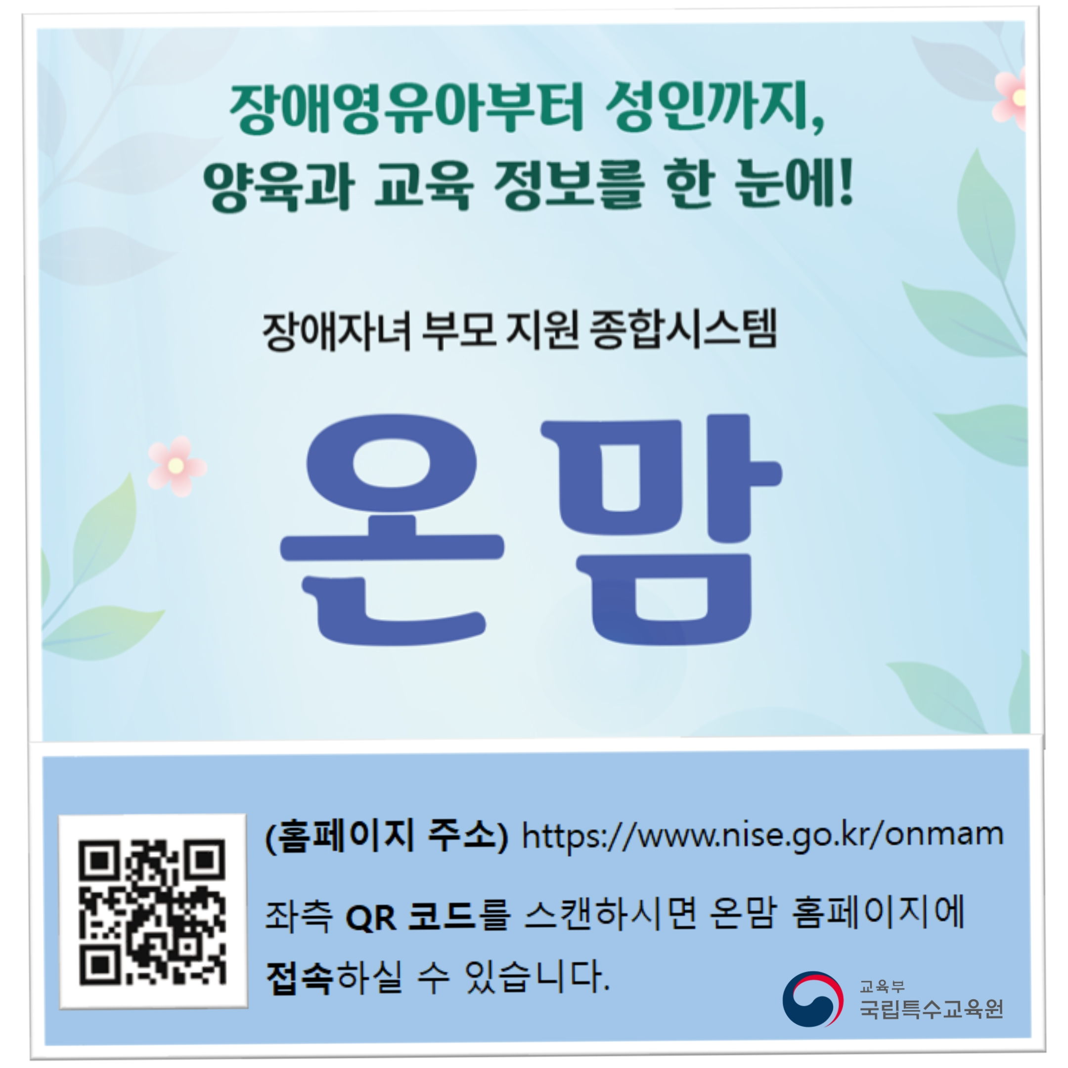장애학생 부모에게 체계적인 양육 및 교육 정보를 제공하기 위한 장애자녀 부모 지원 종합시스템 「온맘」 누리집을 안내합니다. 양육 및 교육 정보가 필요하신 부모님들께서는 적극 활용하시기 바랍니다.
