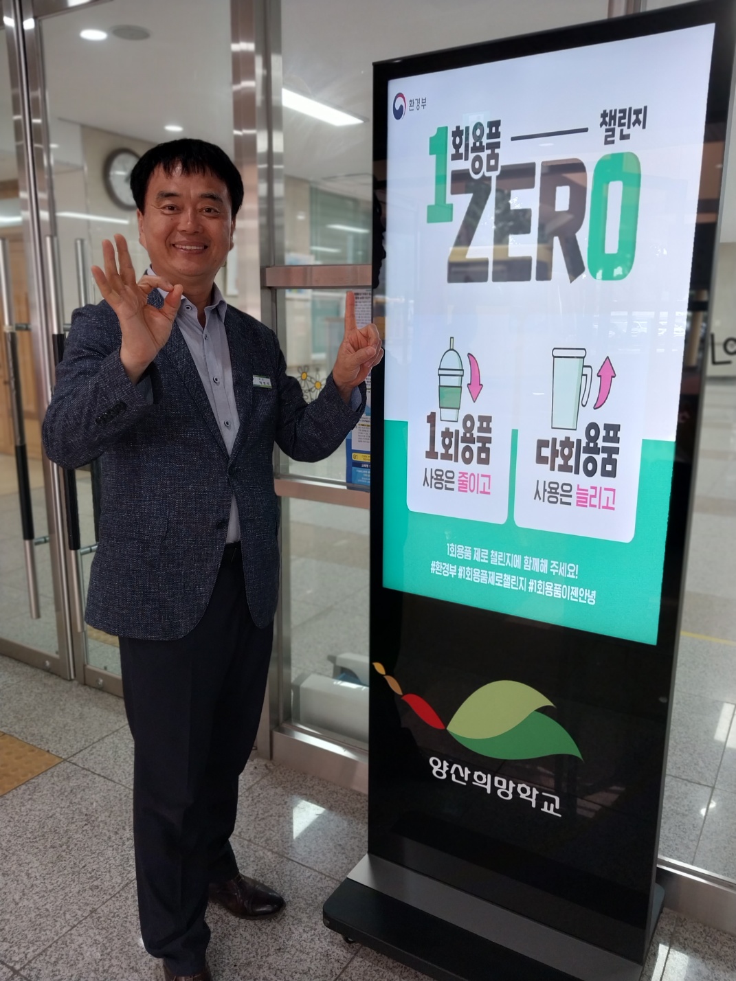 안녕하세요, 양산희망학교 교장 박영식입니다. 저는 일상 속 1회용품을 줄이기 위해 '1회용품 제로 챌린지'에 참여합니다. 일회용품 사용은 줄이고! 다회용품 사용은 늘리고! 양산희망학교에서는 평소 생활과 각종 회의에서 1회용 컵과 페트병 사용을 줄이고 다회용 컵과 텀블러 사용을 늘려가겠습니다.